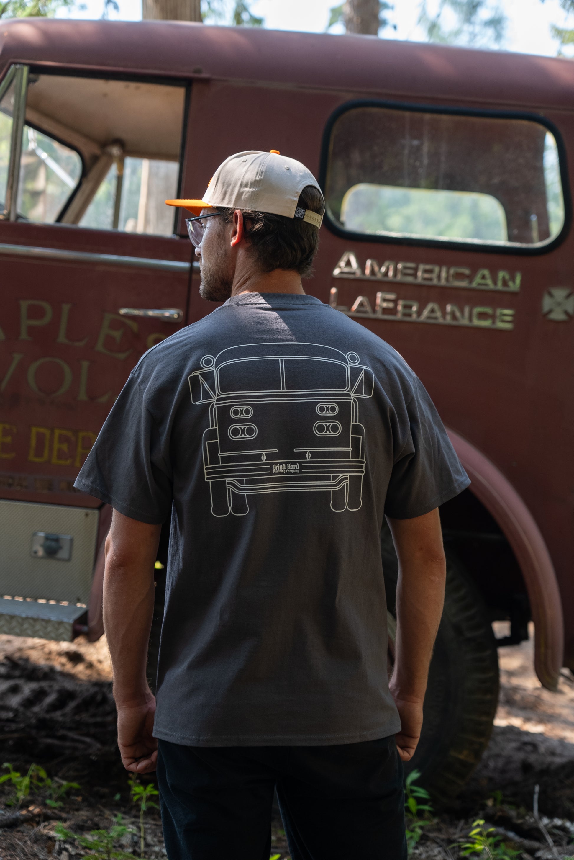 Get ready to roll out in style with our Firetruck Tee, inspired by the classic firetruck we're dreaming of finishing one day. This charcoal tee brings a fun, vintage vibe to your casual look. Soft, comfortable, and a nod to timeless heroism.