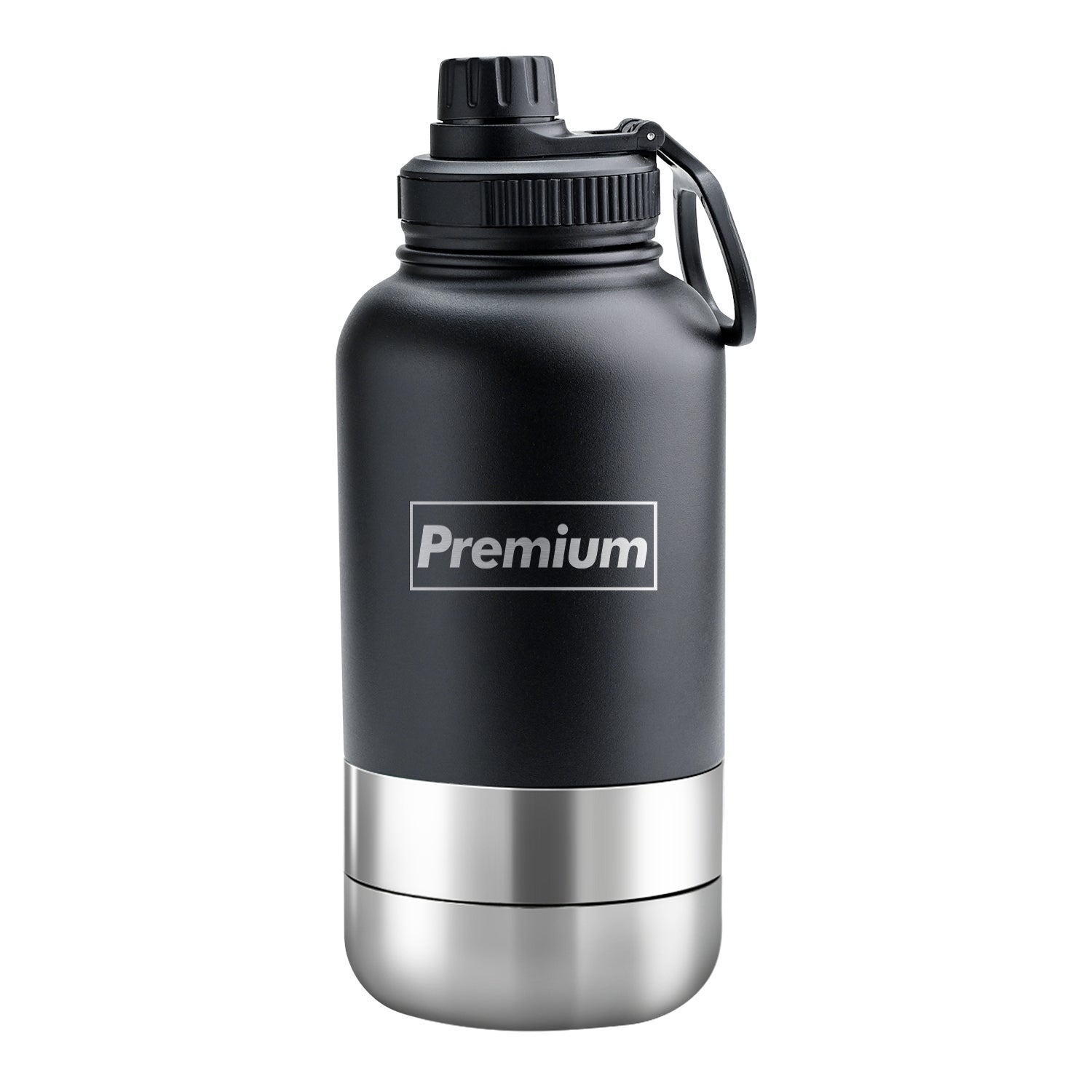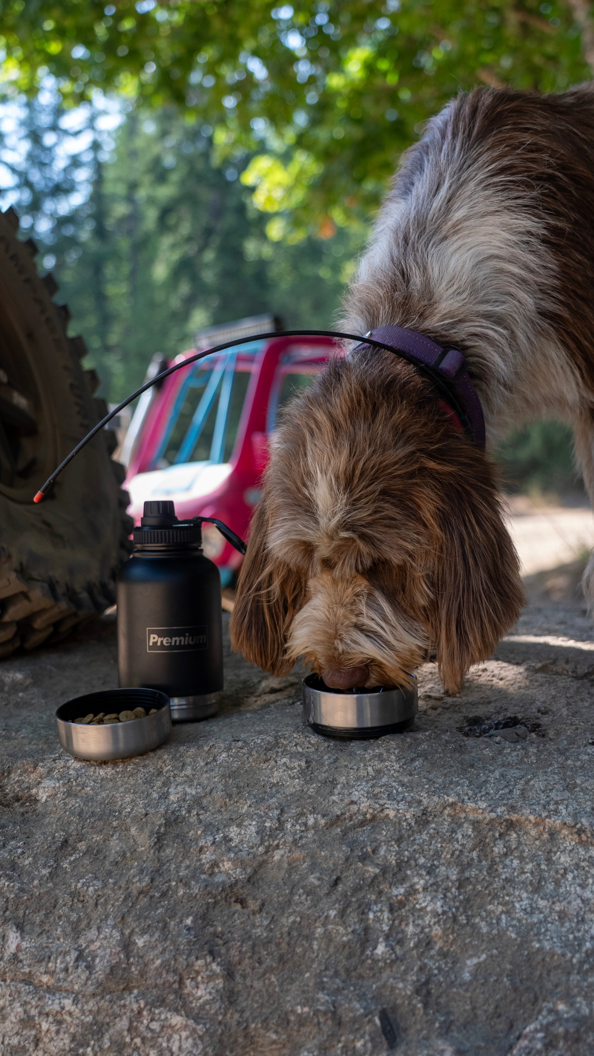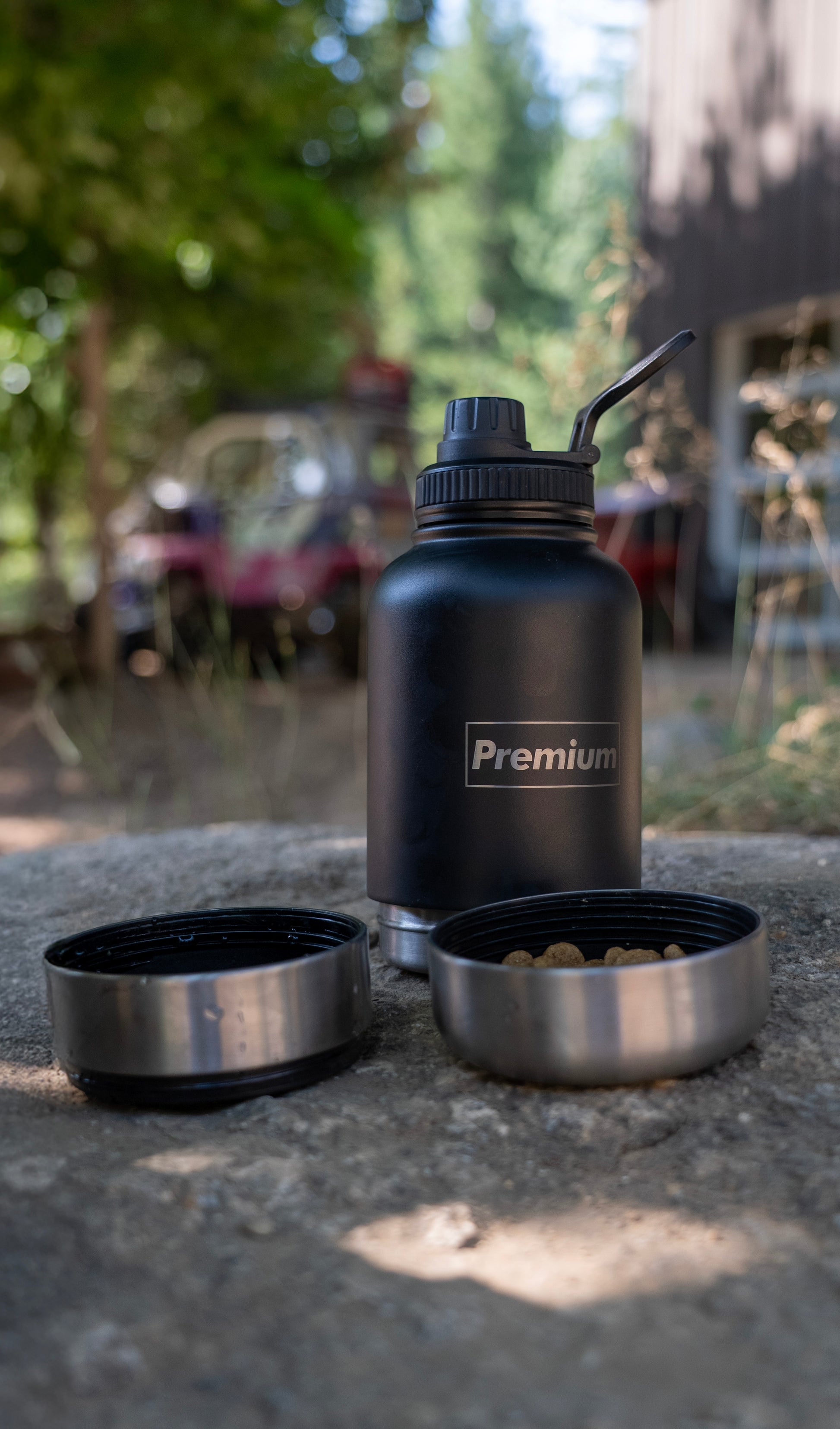 This 3 in 1 water bottle will do it for you! It's a 32oz water bottle for you, and it has two bowls attached where you can keep your pet's food and water.